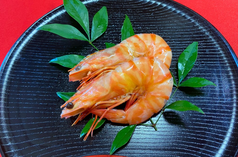 えびは、ひげがある見た目や丸まった状態がお年寄りをイメージさせることから、「長寿」のしるしとされています。