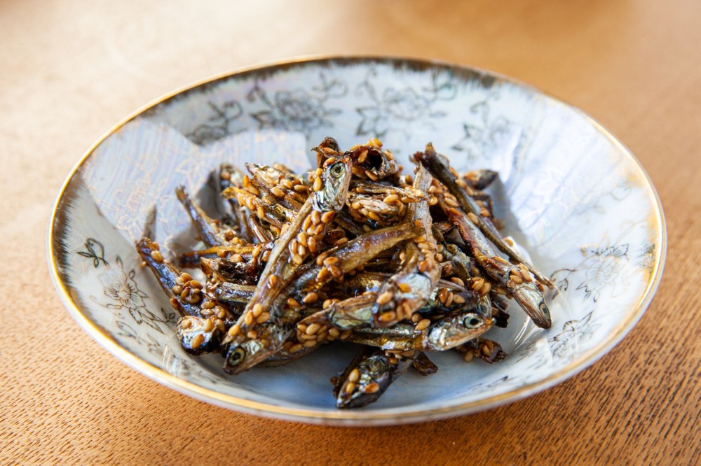 カリカリに焼いて、甘く味つけした小さな魚のお料理です。